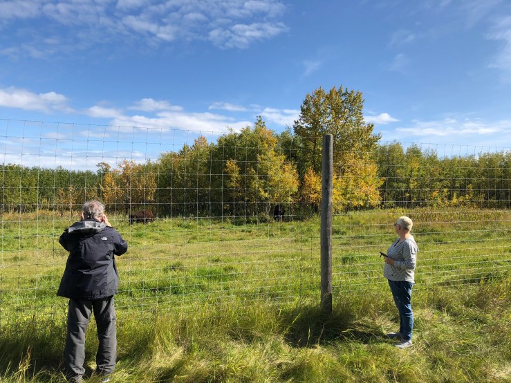 On this September day, our search for bison is futile until we are about to leave the park. At the fenced eastern edge, we discover an elusive pair grazing. Since this encounter is in the south end of the park, the Wood Bison Reserve, Iโm assuming these are indeed Bison Athabascae. One powerful animal is partly obscured in the bush, vigorously scratching their furry hide on Aspen tree branches, bark and trunk.