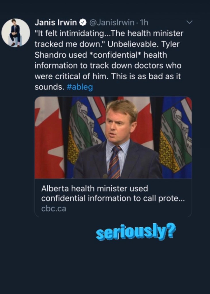 Meanwhile Health Minister Shandro and his wife shamble down the street towards a neighbour doctor to shout enraged insults across their front lawn as they profiteer from the UCP privatization of our health system. The lot of them revile and rip up the contracts of the doctors. Have a hate on for the nurses. Could care less about teachers. Or the poor.