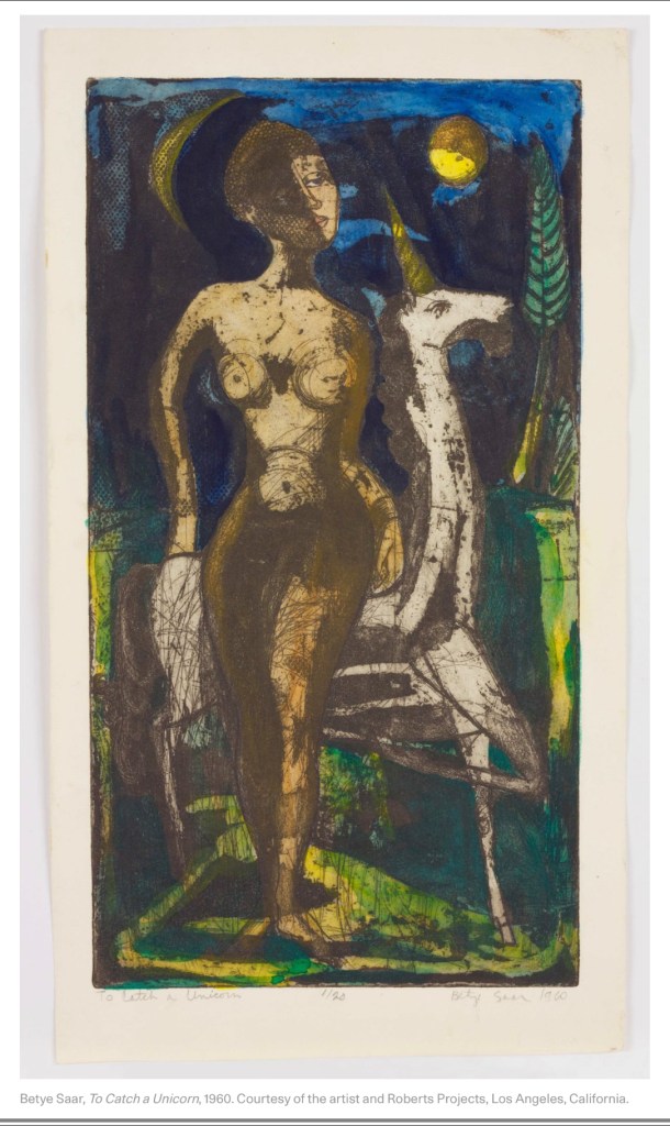 The brilliant visual work of two women artists revises this narrative. Betye Saar’s powerful etching To Catch a Unicorn figures a strong and sensual woman side by side with the companionable unicorn. Hunters are nowhere to be seen. Los Angeles-born Saar was one of the co-creators of the 1960s Black Arts Movement that developed parallel to the Civil Rights and Black Power Movements and included some of the most remarkable writers and artists of our time.