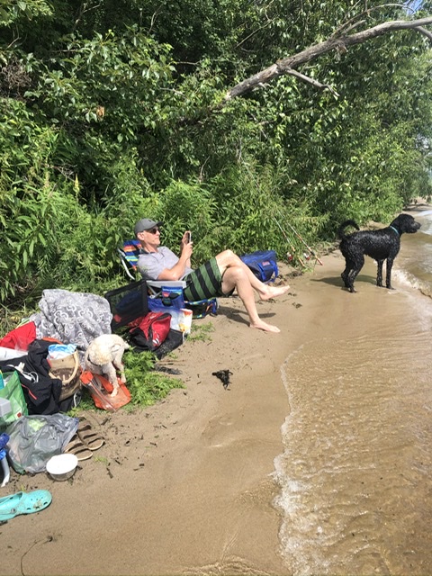 I called my friend Sheena to see if she wanted coffee early Sunday morning but she and her family were already en route to Pigeon Lake Provincial Park to go fishing. I tagged along rummaging through my drawers for my bathing suit and donning a big hat for the sun and shoes for walking through water as the small private beach they perched on at the edge of the water required some litoral navigation en route. It was a splendid morning clouding about 1:30 so we drove back to Edmonton. People on the public beach were distancing in groups. And a group of people gathered in a meadow with drums and guitars – they too seemed to arrange themselves in social groups though this distancing dissolved from time to time.