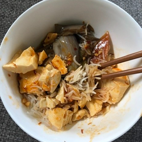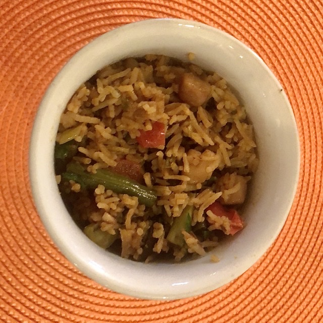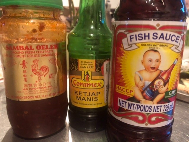 That night friends came for a bbq outside. It was a splendid night and the meal was wonderful. Nathalie made delicious quiche. And Donia bbq’d skewed chicken and vegetables. The chicken had been marinated in yogurt and special Lebanese spices. Kim brought berries and whipped cream. I made a delicious fried rice with delicate mushrooms and chopped fresh bok choy from T&T and Indonesian soy sauce Ketjap Manis and garlic chilli sauce Sambal Oleg and Thai Golden Boy fish sauce and other delights. Below are the wares. And my fried rice on the left and the prepared eggplant and tofu with rice on the right.