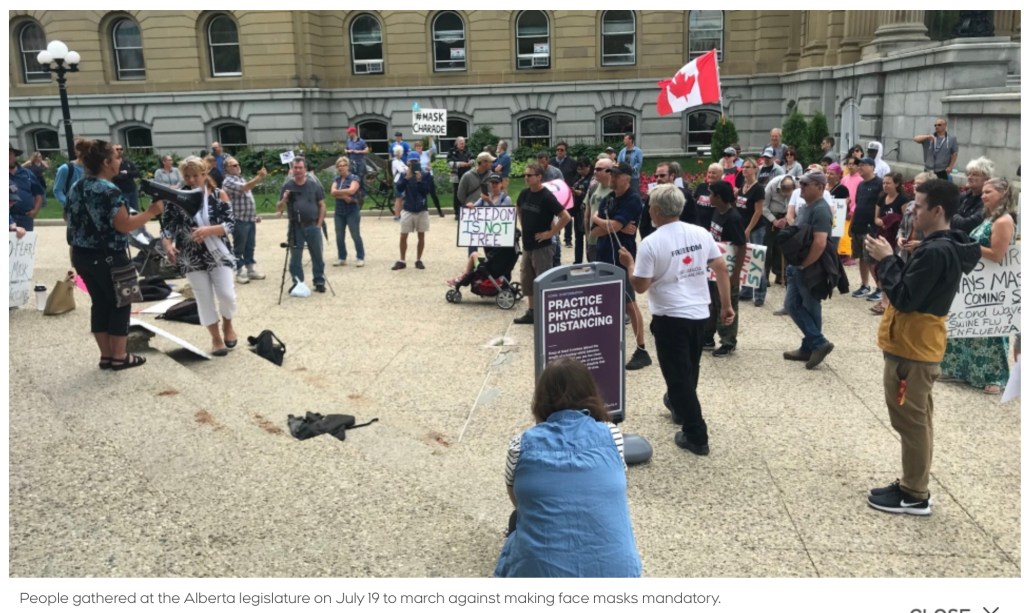 In preparation for Calgary City Council debating mandatory masks, on July 19 small groups of people demonstrate in Calgary and Edmonton against wearing masks. COVIDIOTS. The Edmonton demonstration appears to be minuscule. Why does the media not report the numbers?