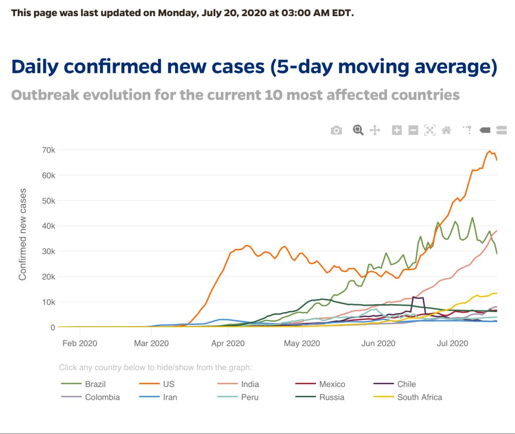 World news is a horror. The virus speeds through the U.S., through Brazil, and India. Trump is losing ground in the U.S., now a caricature of a caricature, such a fabricated adventure in human subjectivity that even his most sycophantic supporters are becoming unglued.