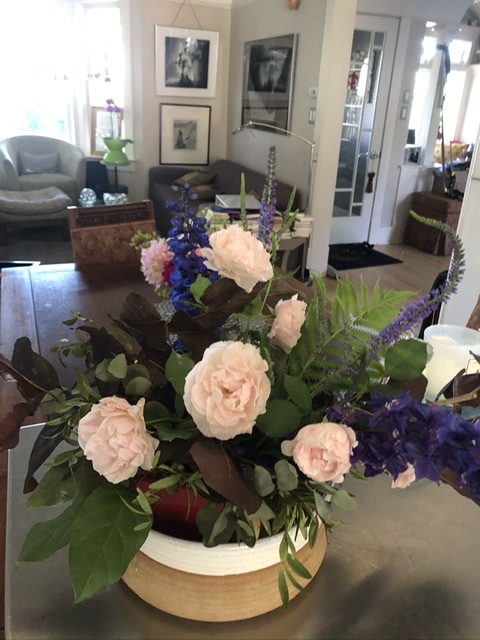 My motto. Be like Ella. In reality. I haven’t done enough gardening this summer. But yesterday I whacked away at weeds and dragged heavy things here and there and made the last bouquet of peonies and took in some roses before the storm. The bouquets I gather collect pink peonies and soaring Prussian blue delphinium stems and rescued bush rose blooms. Their colours light up the house. This morning I feel my body floating with the delicious weight of land labour.