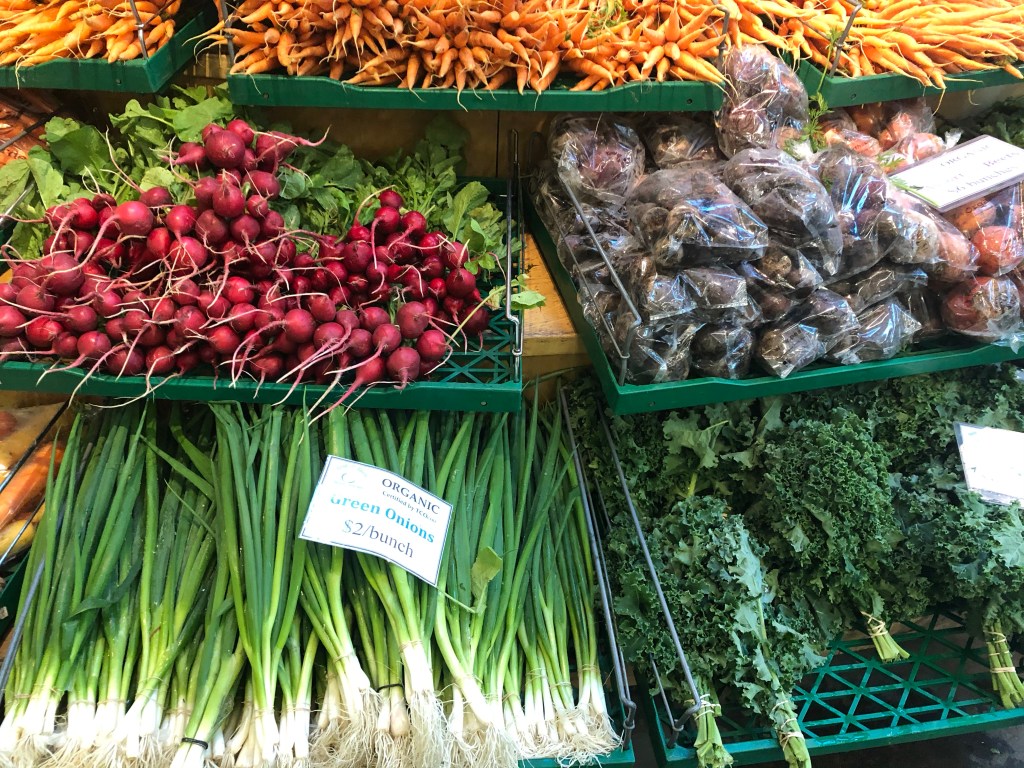 The quiet of the market filled up with amplified music. A bit of Howling Wolf or Reverend Gary Davis. Across the street, a wonderful blues musician blasted out his guitar and voice. The market was populated by enough vendors to offer a phantasmagoria of essentials including Mona’s mushrooms, Four Whistle meats, and lots of veggie vendors.