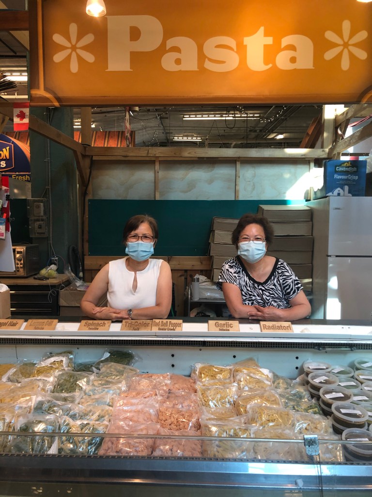 BC fruit sellers were there, all wearing masks. I can’t say the same about all of the vendors. About 1/3 of the vendors wore masks including these wonderful women at Pasta Delight selling fresh pasta, sauces and delicious bruschetta. Their Hong Kong origins gave them experience with the SARS respiratory epidemic. And millions wear masks in Asia as a result, they continues. I said I was so grateful for their care of all of us.