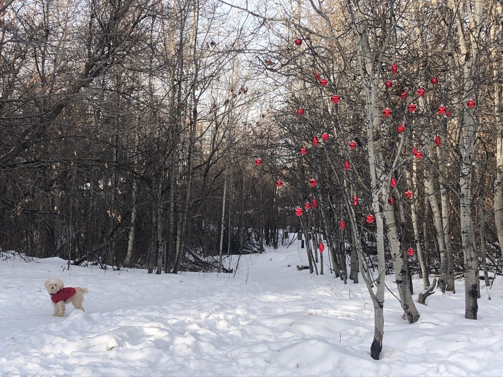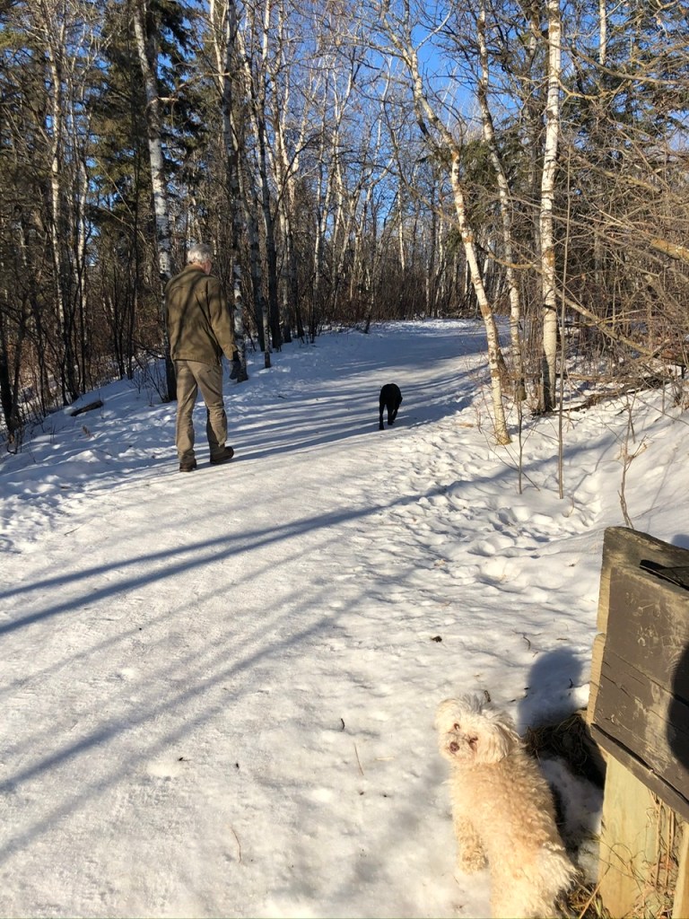 Then we headed through the neighbourhood along the north side of the river past the hoodoos and then back again. It was a busy balmy winter day in Edmonton as we approached the parking lot and entrance to Dawson Park. Simone de Bébé, my toy poodle I rescued five years ago, was leashed around my waist.