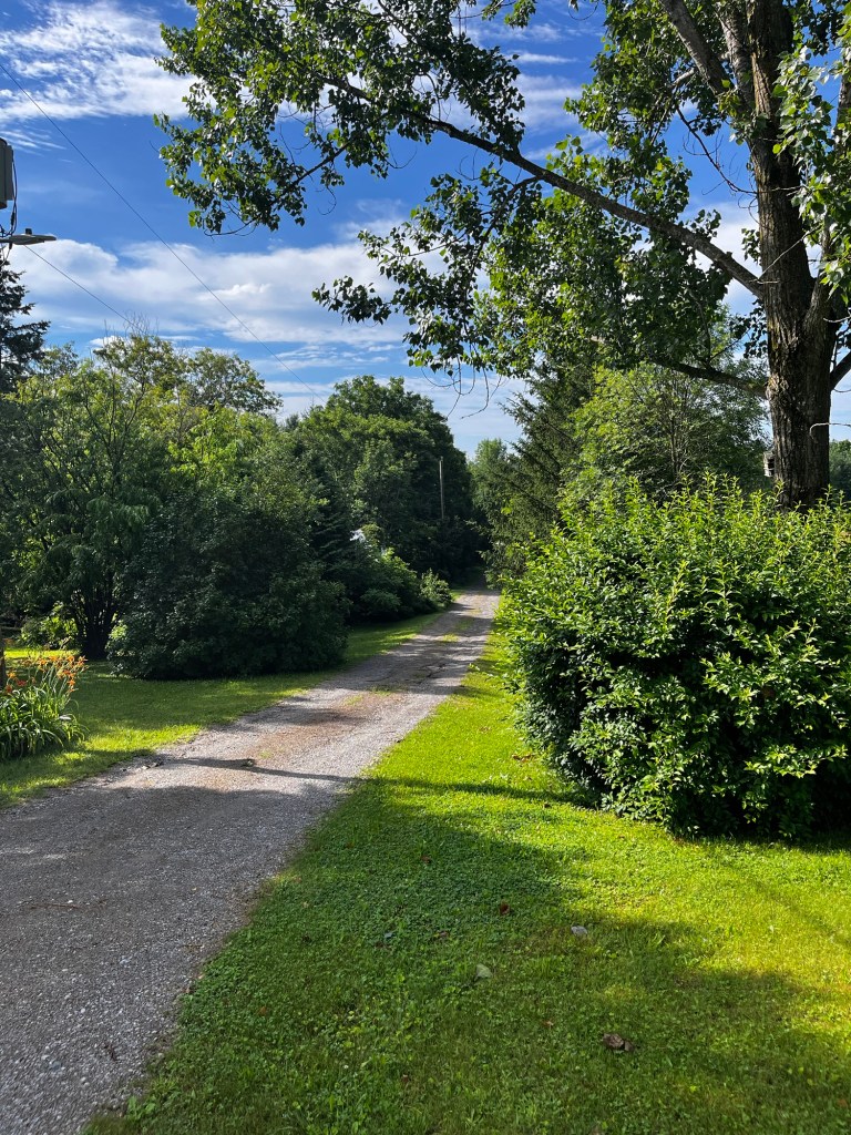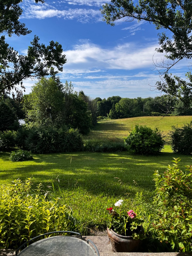 My misery is recorded above after a 12-hour car-plane-train-train-bus-car trip that ended in Ontario humid heat. So the gloom in spite of the beauty of the green vista is well-earned.