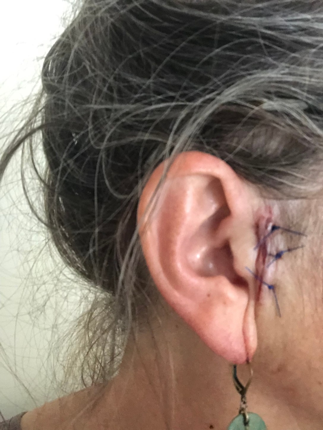 Today the surgeon Dr. Mary Stephens dug with some determination into the sweet spot where the temple arteries run on the right side of my face directly in front of my ear. The arteries were delicate and elusive and it seems to have taken longer than usual to extract a piece of the artery to examine. A delicate specimen that indicated success in her handiwork. During the hour I was wide awake on the pillow, I turned my head on its side. In my ear throughout the procedure I hear a clanging and squishing and the inaudible gestures of a surgeon's blade. I resort to pranayama yoga breathing in my mind and in my mouth and in my lungs. The discipline calms me as a I think how this day surgery is definitely a very good strategy for torture movie scripts. Excruciating begins to encompass it.